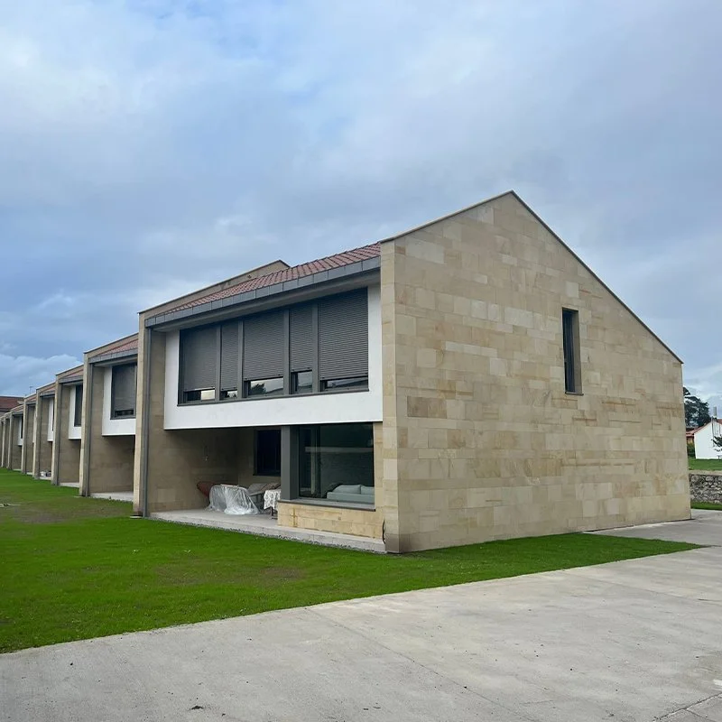 Las viviendas se desarrollan en 2 plantas, con programa de 4 dormitorios. Se diferencia la fachada de acceso con aparcamiento a nivel y trastero de la fachada al jardín privativo a la que se abre a través de un amplio porche cubierto el estar-comedor y la cocina, y los dormitorios de planta alta con fachada acristalada a modo de galería. Muros de piedra y hormigón visto junto a amplios ventanales para generar una imagen contemporánea respetuosa con la arquitectura tradicional.