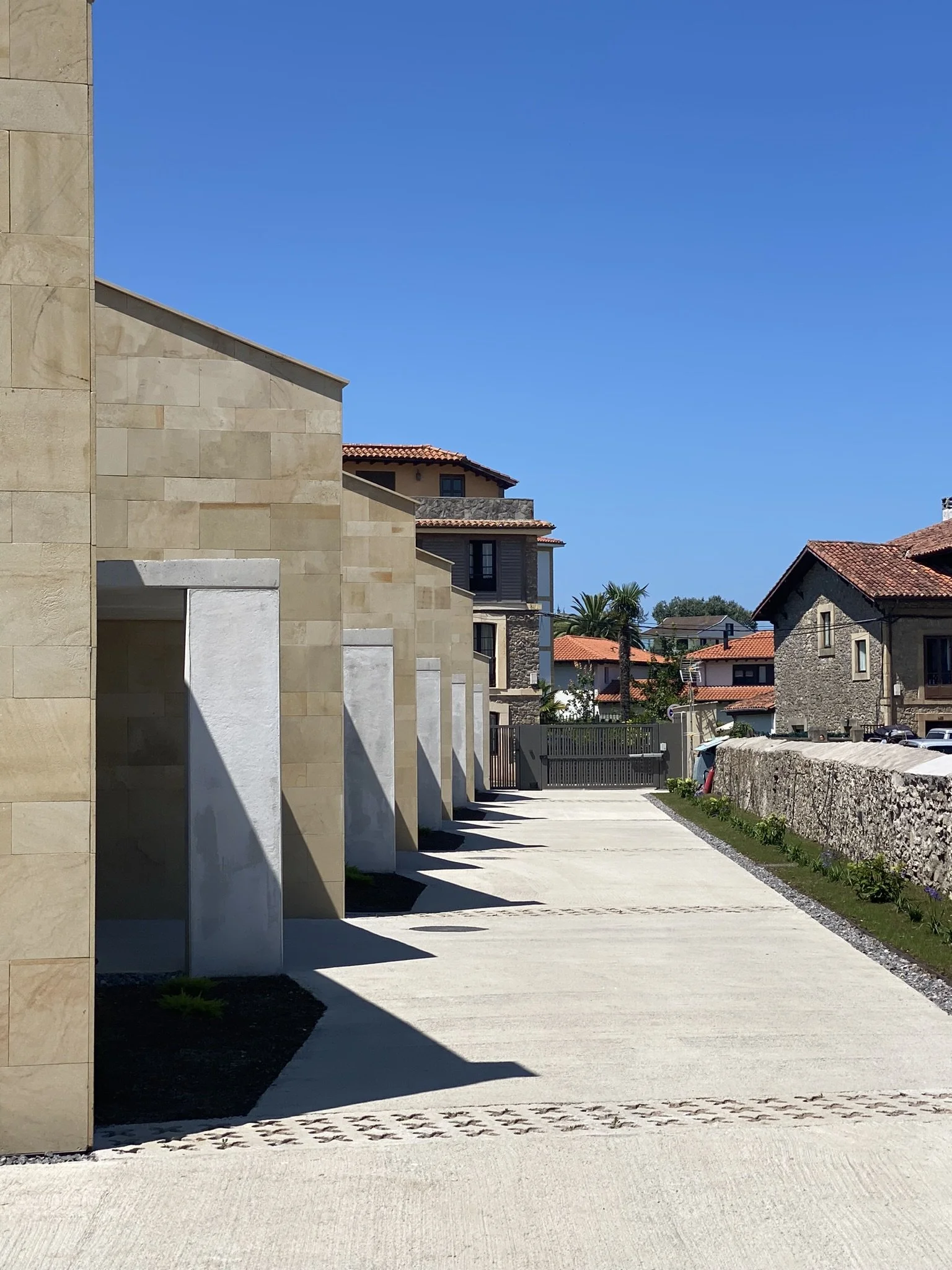La posición de las viviendas, determinada por las características del solar, busca la orientación mas favorable, Sureste, con las mejores vistas hacia la cordillera de Sueve y el Pico Pienzu. Se establecen dos conjuntos de 5 viviendas, en dos alturas, para generar el menor impacto visual en la zona, Se respeta el muro existente original a la calle, configurando el espacio de entrada.